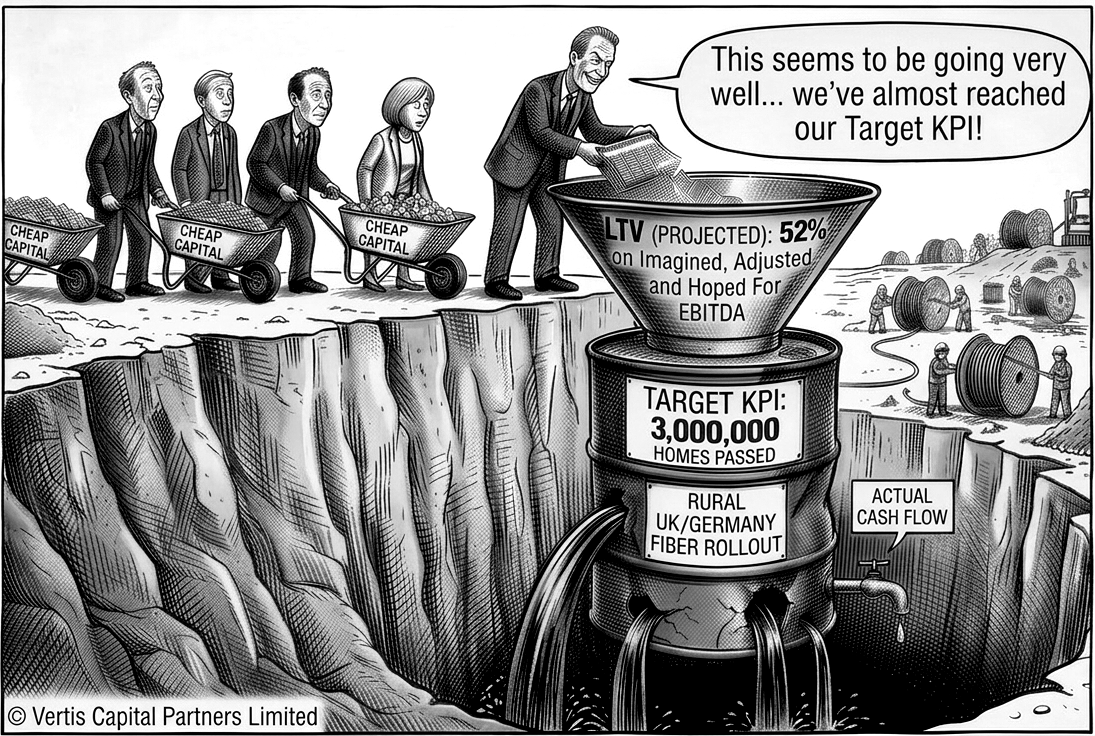 Vertis does not dispute the underlying logic. In fact, some of us have (in our previous lives) debt-funded emerging Alternative Telecom Networks ("AltNets"). We have directly engaged with more than thirty operators across the UK and continental Europe. We have learned a simple lesson: the asset class is only as defensive as the assumptions beneath it. When those assumptions are wrong - as they have proven to be on take-up rates, competitive intensity, and the timeline to cash flow breakeven - the downside can be severe, and conventional credit metrics offer little protection.